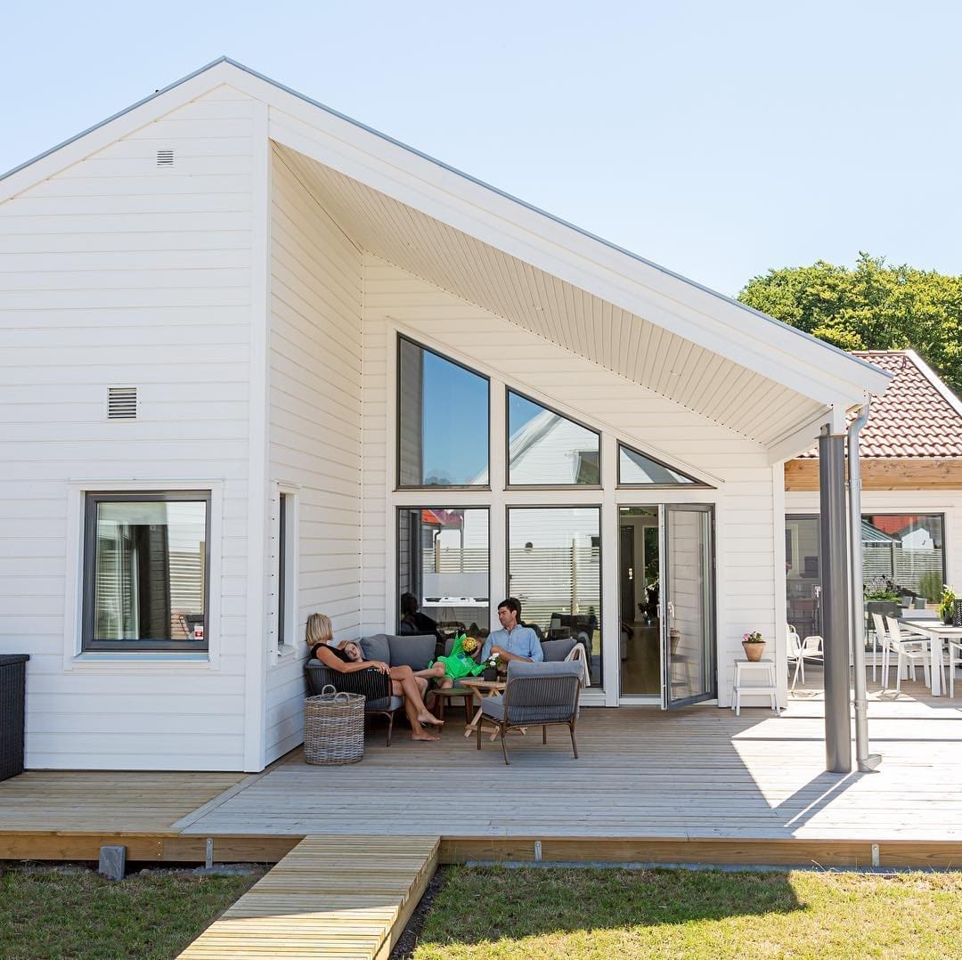 Mit 140 Quadratmetern Wohnfläche und seiner imposanten Front ist Sjöholmen der Mercedes unter den Bungalows von Eksjöhus: ein modernes, eingeschossiges Haus im New-England-Style mit einem aufwendig gewalmten Dach. Das an der Vorder- und Rückseite vorgezogene Satteldach mit den runden Giebelfenstern betont die architektonische Mitte des Hauses, beeindruckend unterstützt durch die großzügige Kathedraldecke im Wohnbereich und den spannenden Lichteinfall.