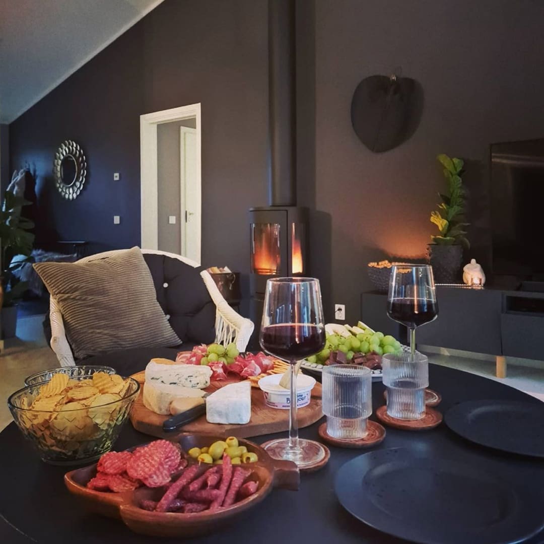Die nächste gemütliche Impression zeigt den Wohnbereich von @klintsgata, einer vierköpfigen Familie, die in Eksjö ebenfalls in einem Haus vom Typ Prio 143-Häuser lebt. Die braune Wandfarbe harmoniert bei ihnen perfekt mit dem Kamin und der Farbe des Ofenrohrs. Hier haben sie den Kamin angezündet und den Tisch für einen schönen Abend im Warmen gedeckt.