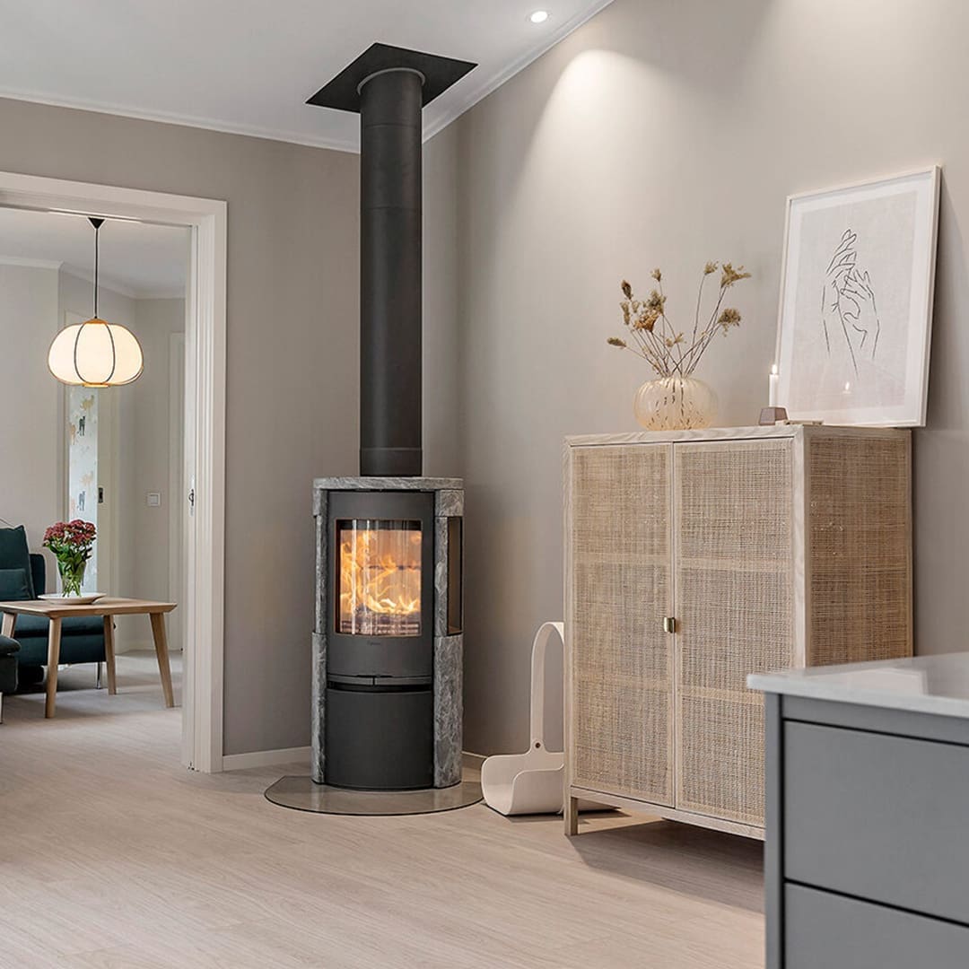 Kamine und Kaminöfen sind eine stilvolle Ergänzung zur Inneneinrichtung – und dank der offenen Grundrisse in Häusern von Eksjöhus lassen sie sich aus verschiedenen Ecken und Winkeln des Hauses genießen.
