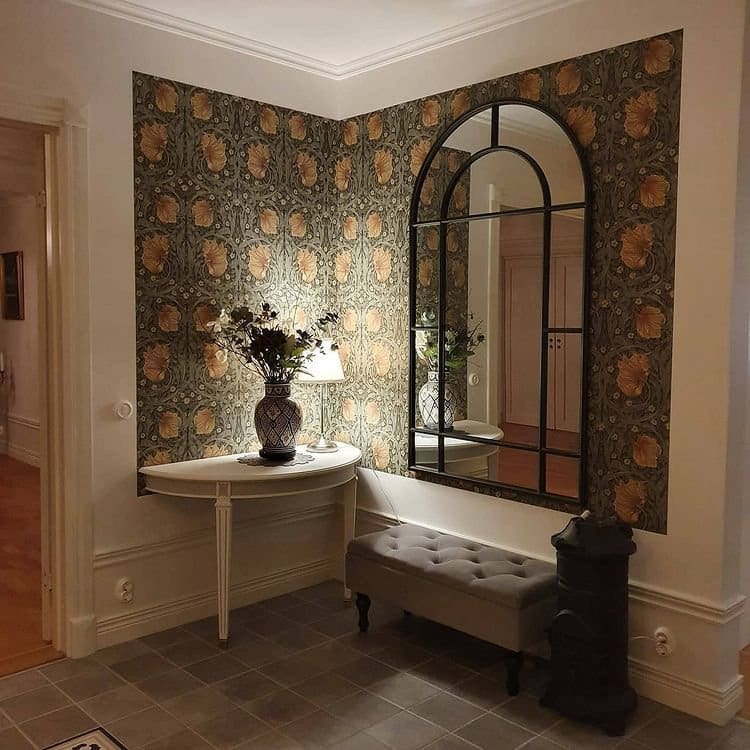Farben, Formen und Muster prägen den gemütlichen Eingangsbereich von @eksjohus_ekeberga_special. Die Fliesen sind pflaumenfarben, und die Tapete mit großen Medaillons trifft auf eine weiße halbrunde Konsole und ein graues Sitzbänkchen. Typisches Winterprogramm: kurz Platz nehmen, Schuhe ausziehen, und dann schnell aufs gemütliche Sofa – oder in die Wanne.
