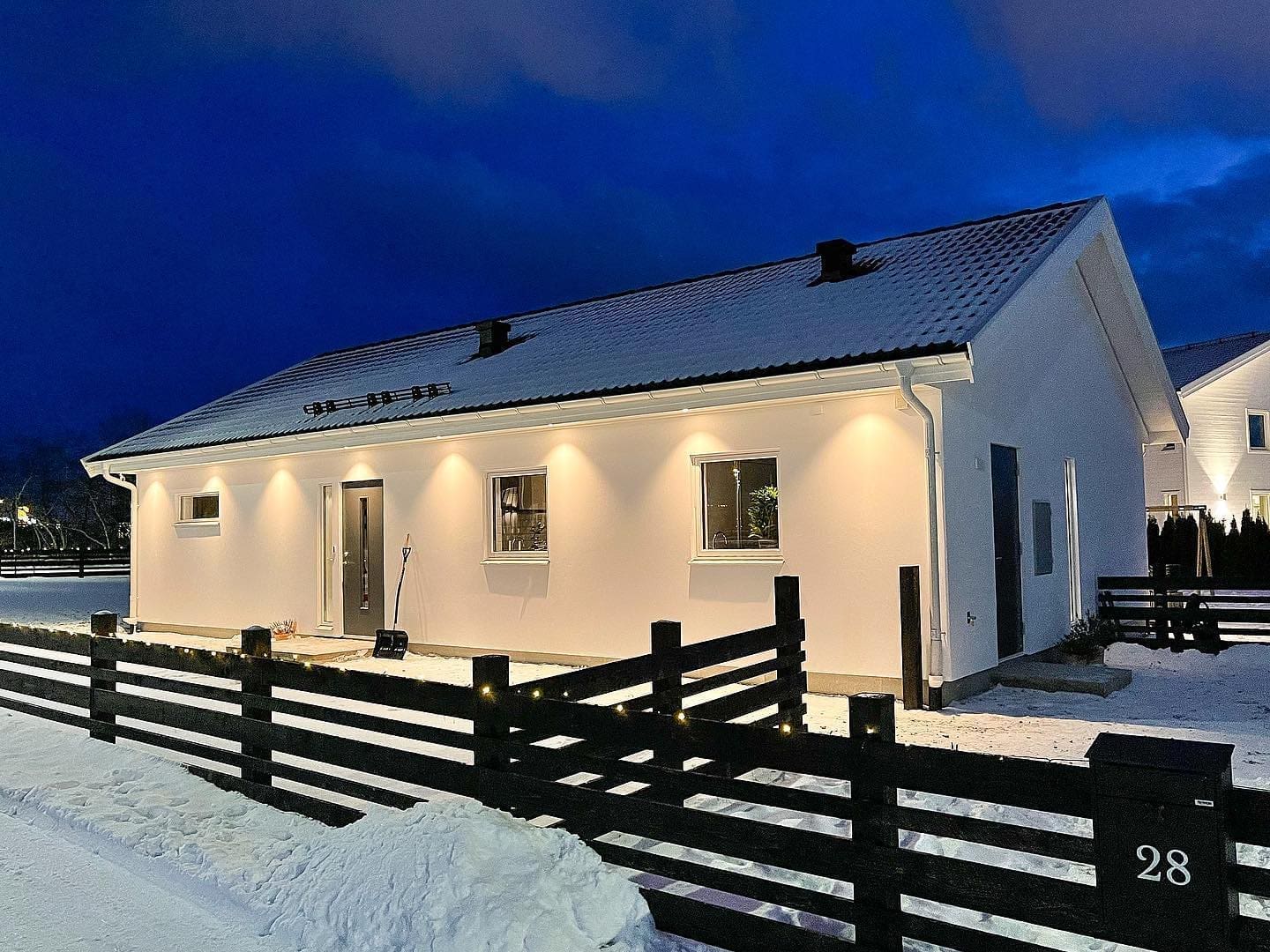 Auf den Bildern von Häusern unserer schwedischen Kunden sehen Sie auch, wie harmonisch die Fassadenbeleuchtung das Haus in der Abend- und Morgendämmerung beleuchtet – und natürlich bei Nacht.