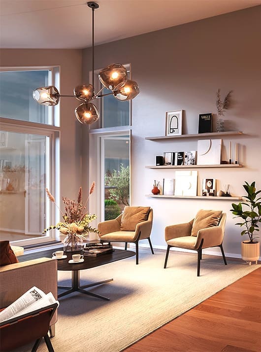 Auch im Wohnzimmer oder im Schlafzimmer schaffen Hängeleuchten Atmosphäre. Eine große Leuchte in der Mitte des Raums oder mehrere kleine Leuchten dienen dazu, bestimmte Bereiche des Raums gezielt hervorzuheben.