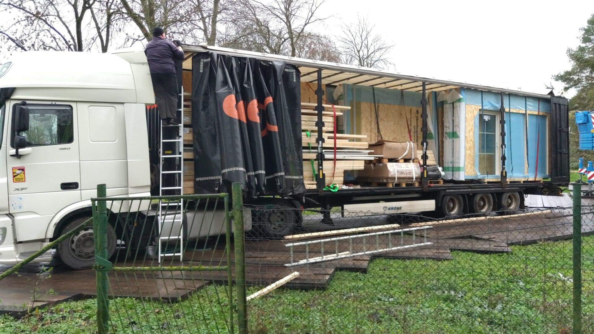Wenn die Vorbereitungen abgeschlossen sind, heißt es warten auf das Haus aus Schweden. Nun wird noch das Gerüst gestellt und die Schwellen montiert. Pünktlich am Morgen des avisierten Liefertages positioniert sich der Kran auf dem Grundstück und die 18m langen LKWs aus Schweden rollen an (in der Regel insgesamt 3-4 LKWs, 2 pro Tag nacheinander).