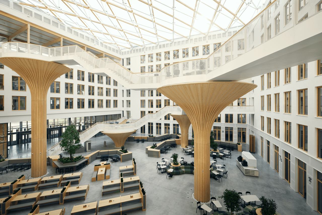 Auch auf dem Gelände der Nordischen Botschaften in Berlin, wo Schweden in einem von insgesamt fünf Gebäuden residiert, wurde viel mit Holz gebaut. So etwa die eindrucksvoll geschwungene Treppe in der Botschaft Schwedens.