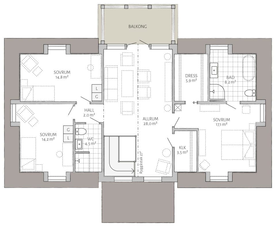 Björkenäs ist ein exklusives, luxuriöses und äußerst funktionsfähiges Landhaus. Der Stil ist von klassischen schwedischen Herrenhäusern inspiriert. Besonders charakteristisch sind das steil abfallende Satteldach mit gewölbten Giebeln und die robusten, zeitgemäßen Säulen, die das elegante Eingangsportal stützen. Die Deckenhöhe im Erdgeschoss beträgt großzügige 2,6 Meter.