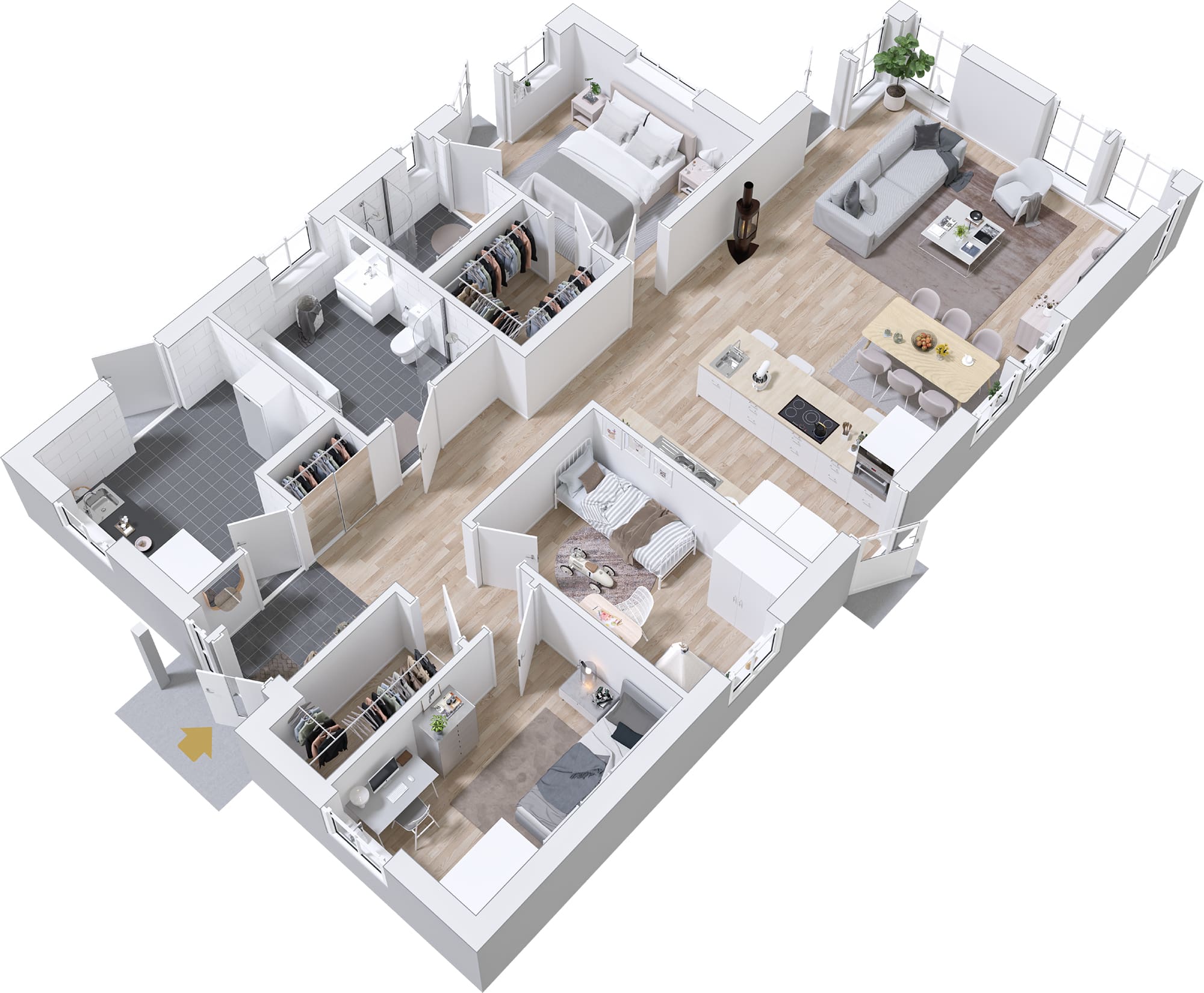 Sobald Du erleben darfst, wie sich Fagerhem mit fließendem Licht zum geräumigen Wohnzimmer hin öffnet, kannst Du die Größe des kleinsten Hauses der Serie leicht verstehen. Fagerhem ist für einfaches Wohnen ausgelegt, mit viel Platz auf kleinem Raum. Mit dem Eingang an der Giebelseite eignet sich das Haus perfekt für kleinere Grundstücke, auf denen jeder Quadratmeter zählt, ohne auf Schlafzimmer, Gemeinschaftsräume oder praktischen Stauraum verzichten zu müssen.