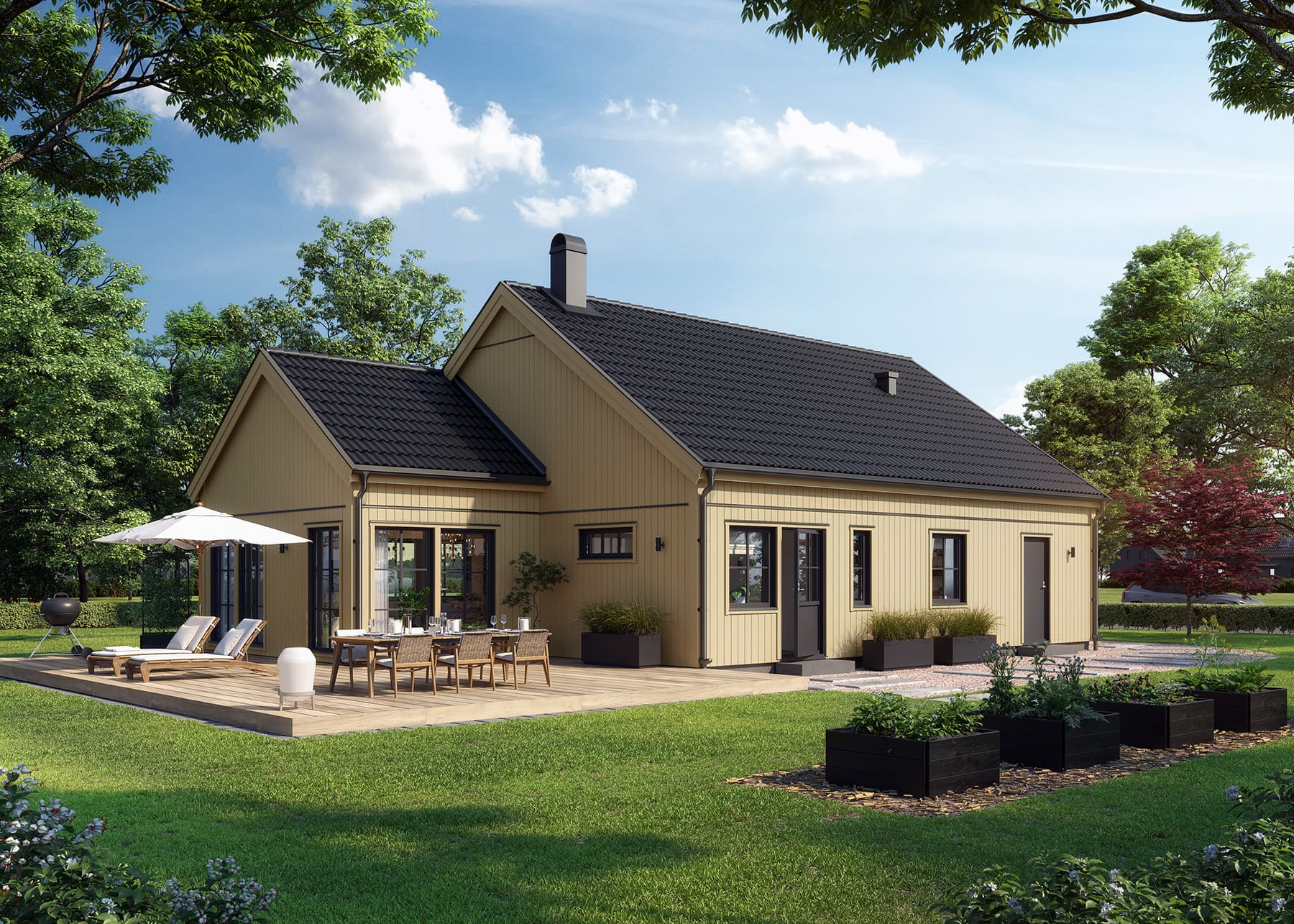 Mit seinen Terrassen in drei Richtungen und großzügigen Fenstertüren, die das natürliche Licht hereinlassen, fühlt sich Fagerhem viel größer als seine 120 Quadratmeter an.