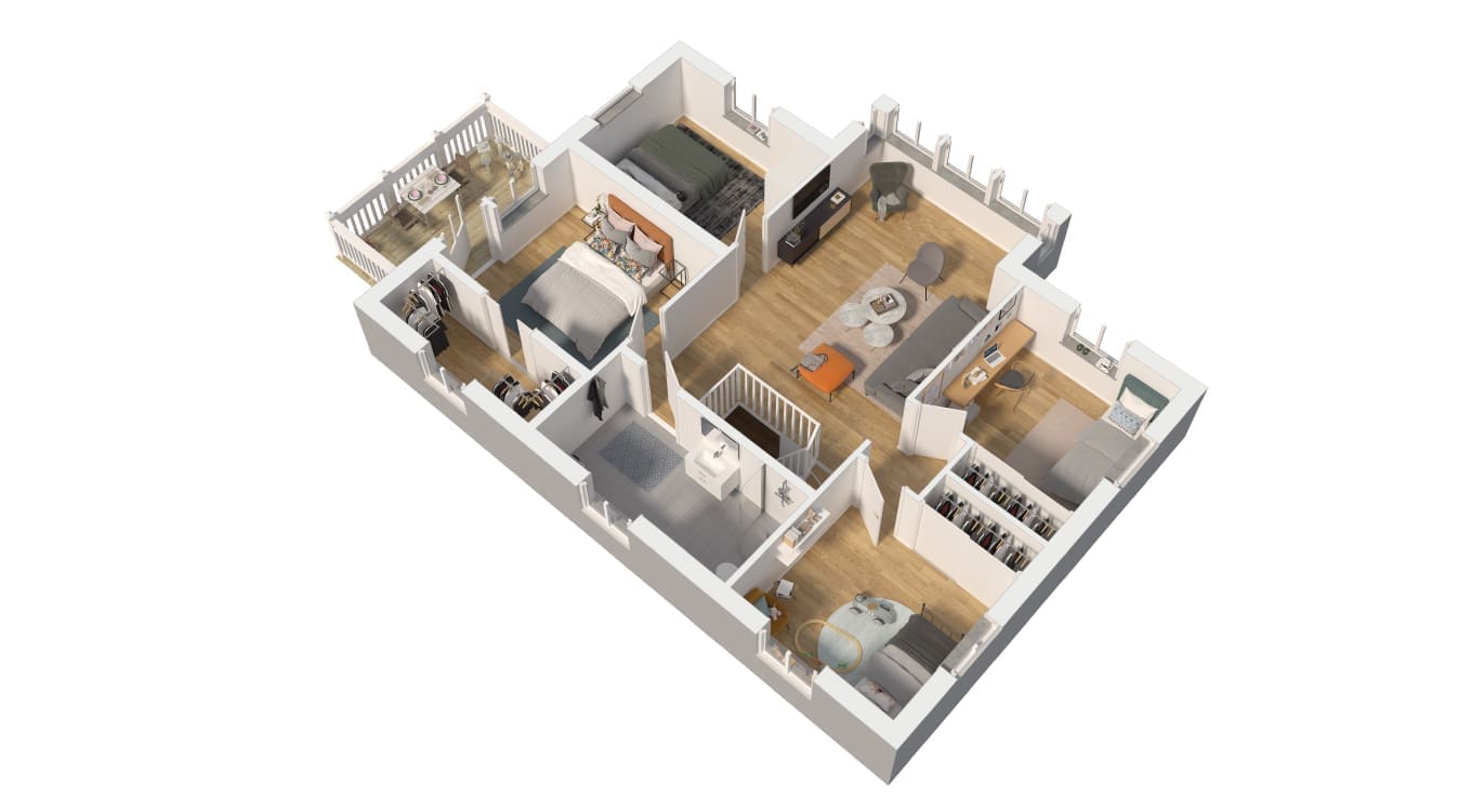 Das Obergeschoss bietet ausreichend Raum und Schlagelegenheit für eine Familie mit drei Kindern. Typisch, ein gemeinsam genutzter Raum mit der Möglichkeit einer Kathedraldecke, die nicht die Wärmedämmung beeinflußt. Sehr excklusiv ist der Zugang zum Balkon geplant, nämlich diekt vom Elternschlazimmer aus. Begehbare Kleiderschränke unterstreichen den Komfortanspruch seiner Bewohner.