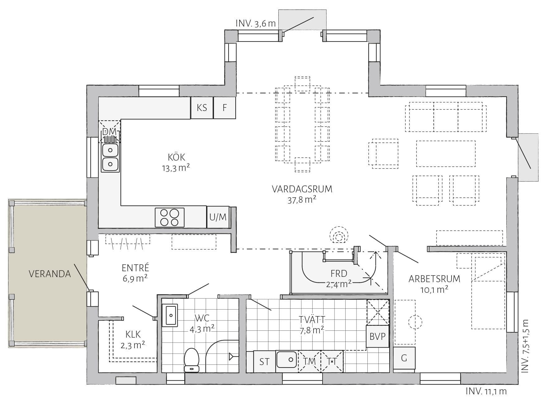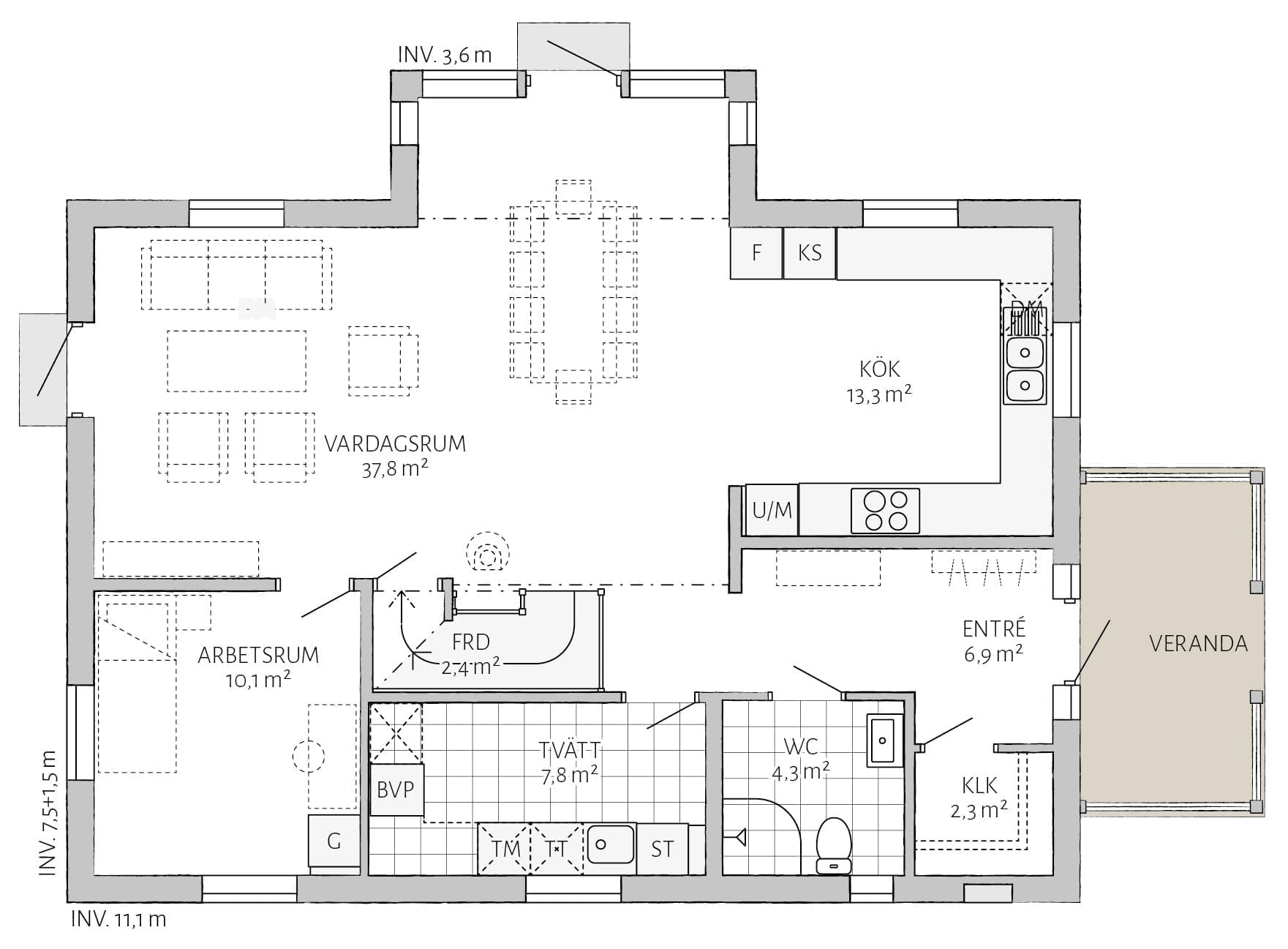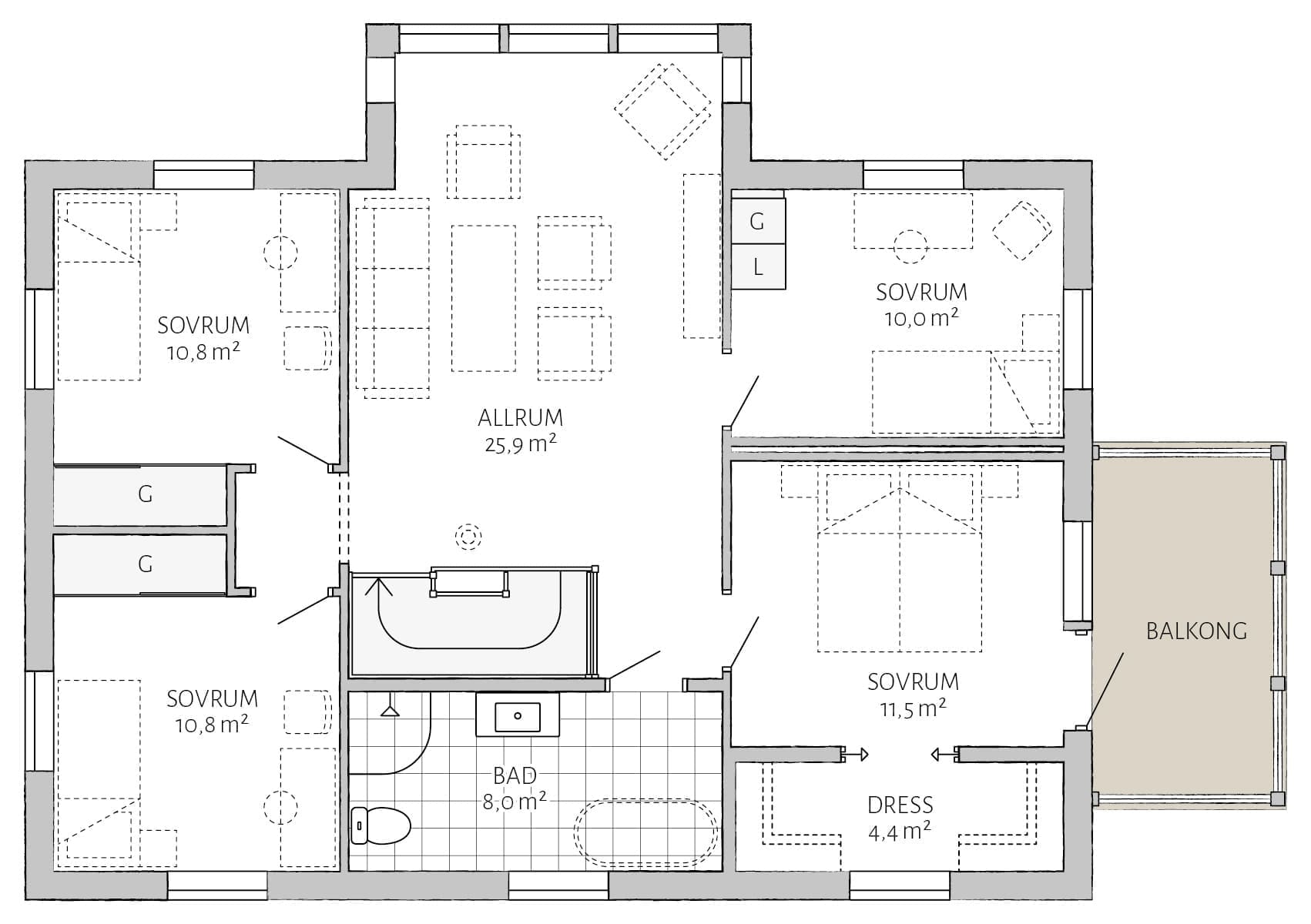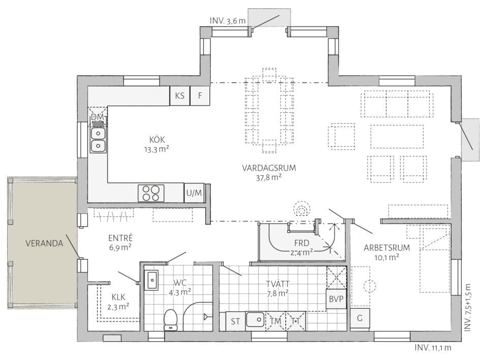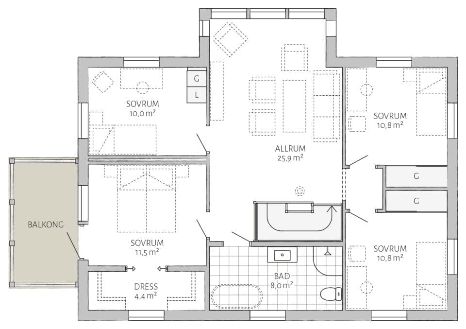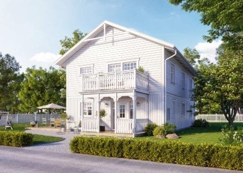 Lindbacken ist ein giebelseitig ausgerichtetes klassisches schwedisches Landhaus, mit vielen Zierelementen aus Holz und durchdachten Details. Die Fassade besteht im Erdgeschoss aus senkrecht und im Obergeschoss aus waagerecht verlegter Holzverkleidung. Der Eingang, über eine Veranda, ermöglicht eine Längsausrichtung des Gebäudes und ist somit ideal für schmale lange Grundstücke. Ein statliches Einfamilienhaus mit zwei Vollgeschossen und Satteldach. Ein gelungener Entwurf für den Platzbedarf einer großen Familie.