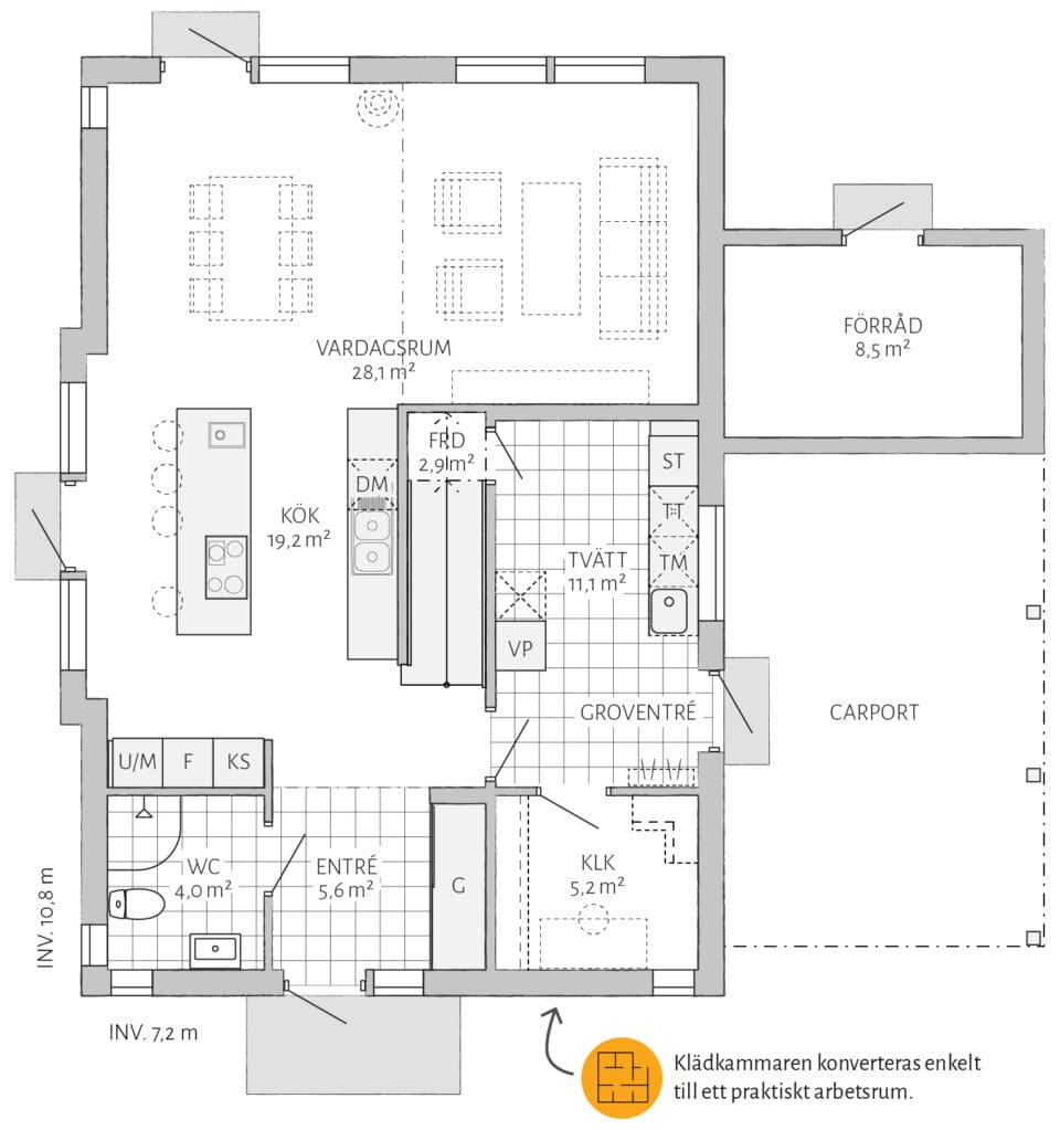 Ljunghem kombiniert praktische Lösungen für große Familien mit großzügigen Räumen, die das Haus zu einem natürlichen Treffpunkt für Freunde und Familie machen.