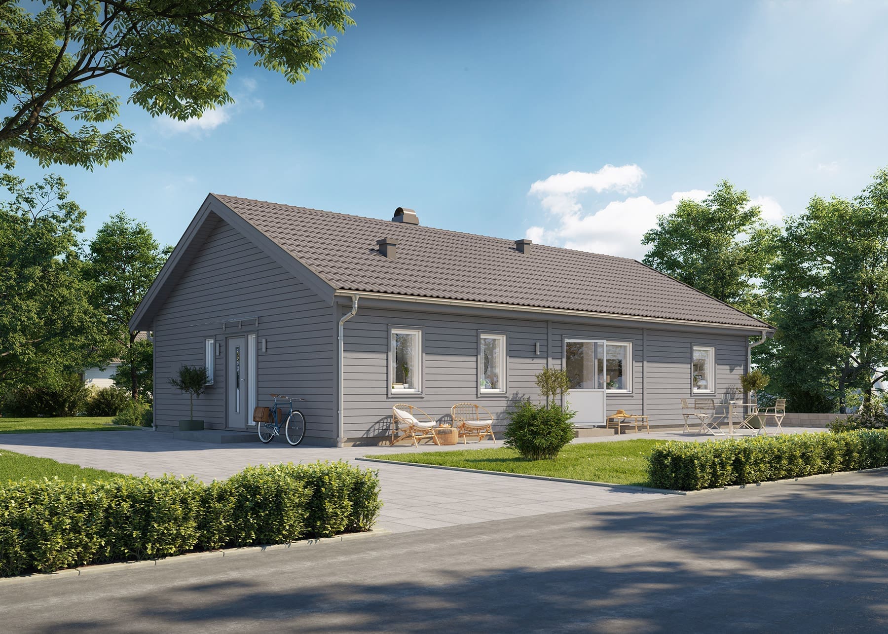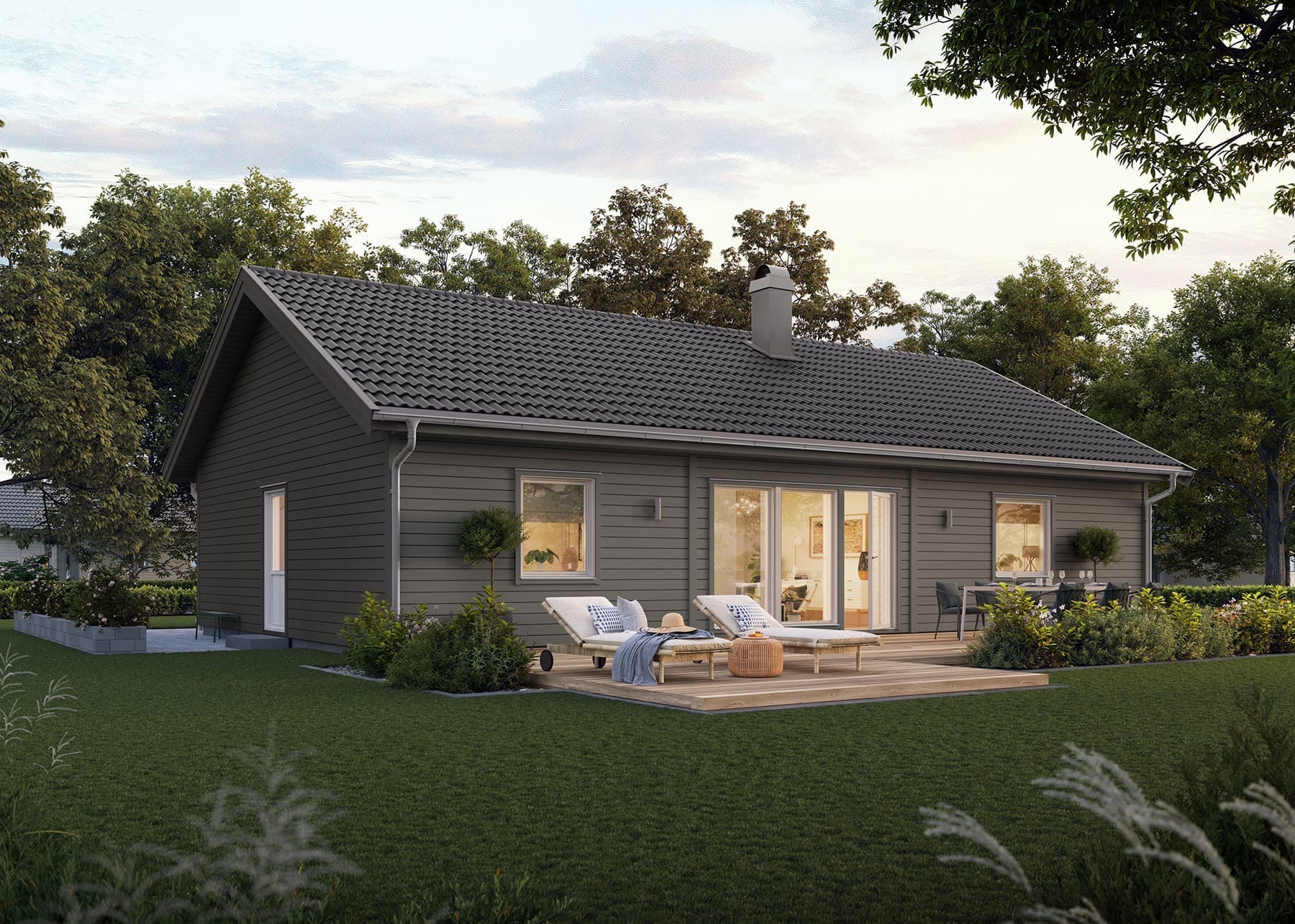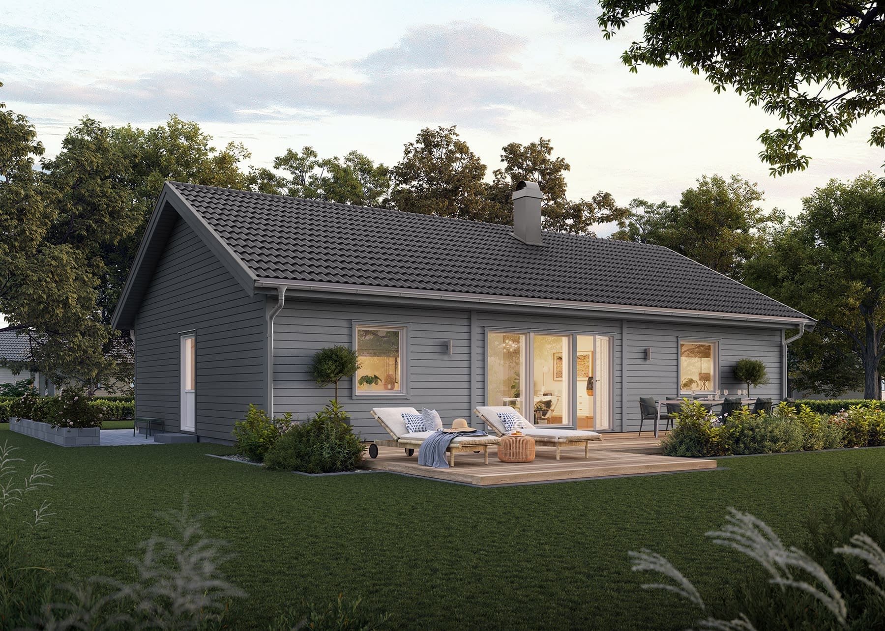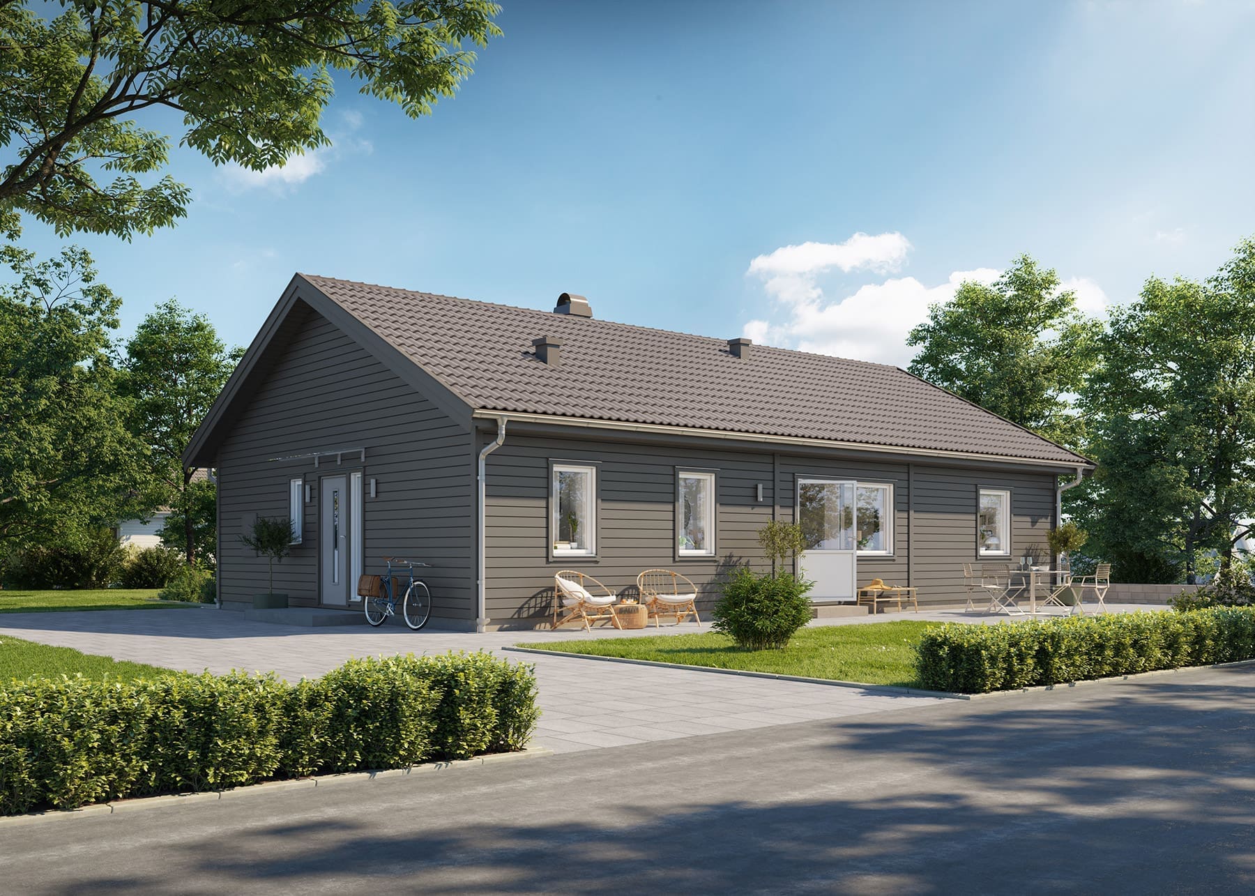 Prio 116 Modern ist ein Haus mit gemütlicher, einladender Optik, das in jeder Umgebung funktioniert. Viel natürlicher Lichteinfall und eine etwas kürzere Traufe unterstützen den eleganten Eindruck. Prio 116 ist das kleinste Haus der Prio-Serie, verfügt aber über alle Räume und Funktionen, die Sie auf einer kleineren Fläche benötigen. In Prio 116 werden Wohnzimmer und Küche zum Herzstück des Hauses und zum Mittelpunkt des Geschehens. Außerdem trennt der offene Wohnbereich auf natürliche Weise die Bereiche der Kinder und der Eltern im Haus.