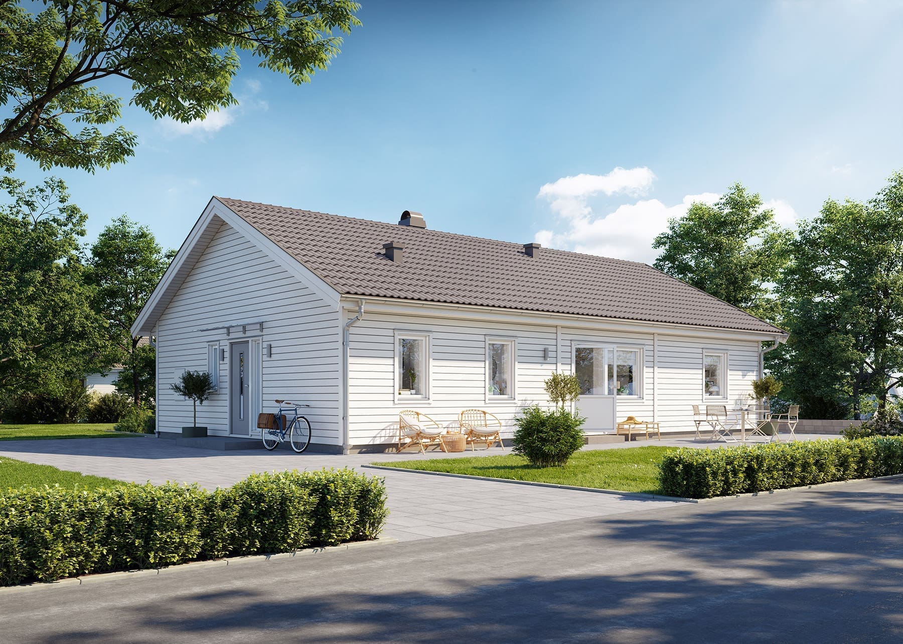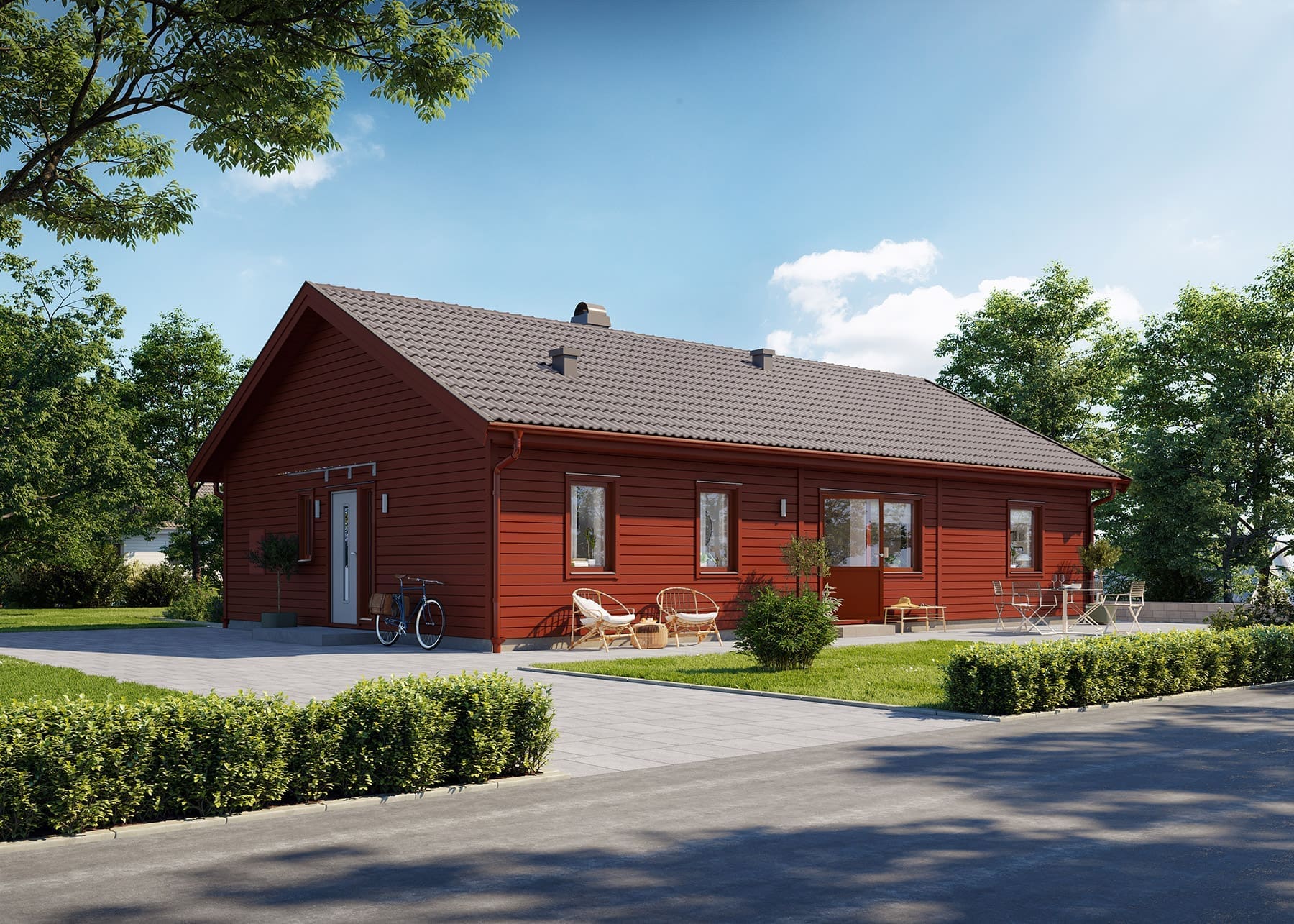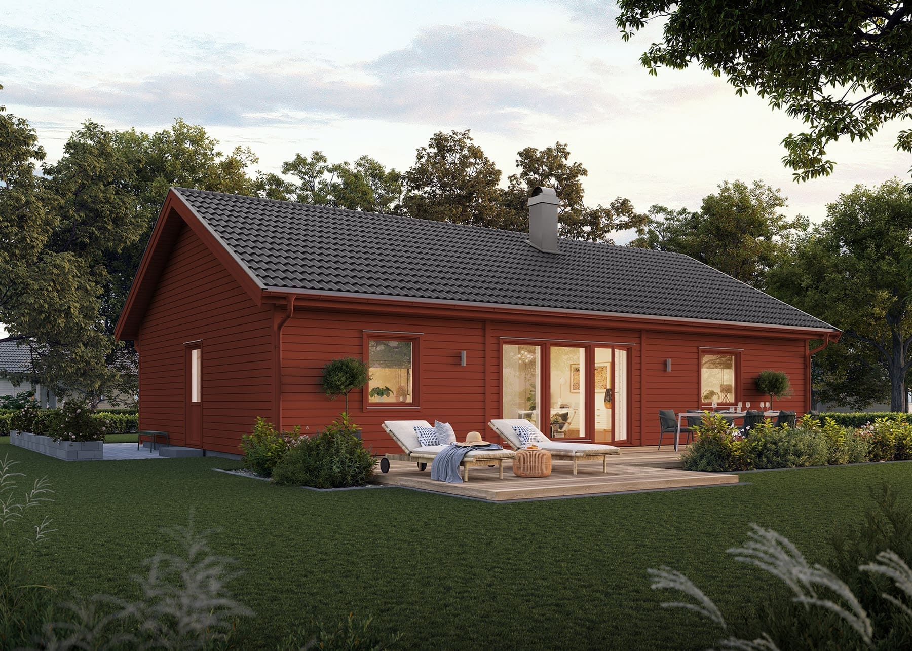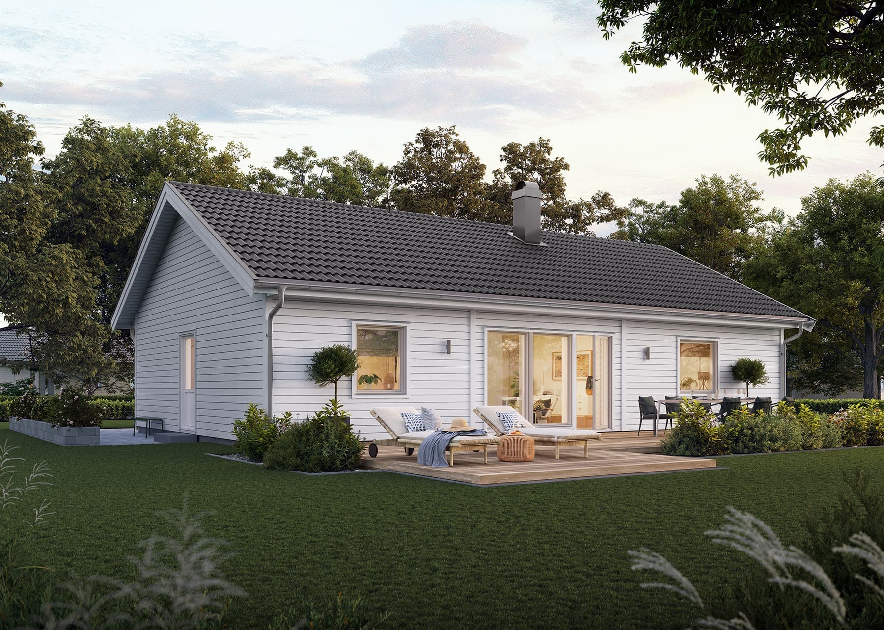 Prio 116 Modern ist ein Haus mit gemütlicher, einladender Optik, das in jeder Umgebung funktioniert. Viel natürlicher Lichteinfall und eine etwas kürzere Traufe unterstützen den eleganten Eindruck. Prio 116 ist das kleinste Haus der Prio-Serie, verfügt aber über alle Räume und Funktionen, die Sie auf einer kleineren Fläche benötigen. In Prio 116 werden Wohnzimmer und Küche zum Herzstück des Hauses und zum Mittelpunkt des Geschehens. Außerdem trennt der offene Wohnbereich auf natürliche Weise die Bereiche der Kinder und der Eltern im Haus.