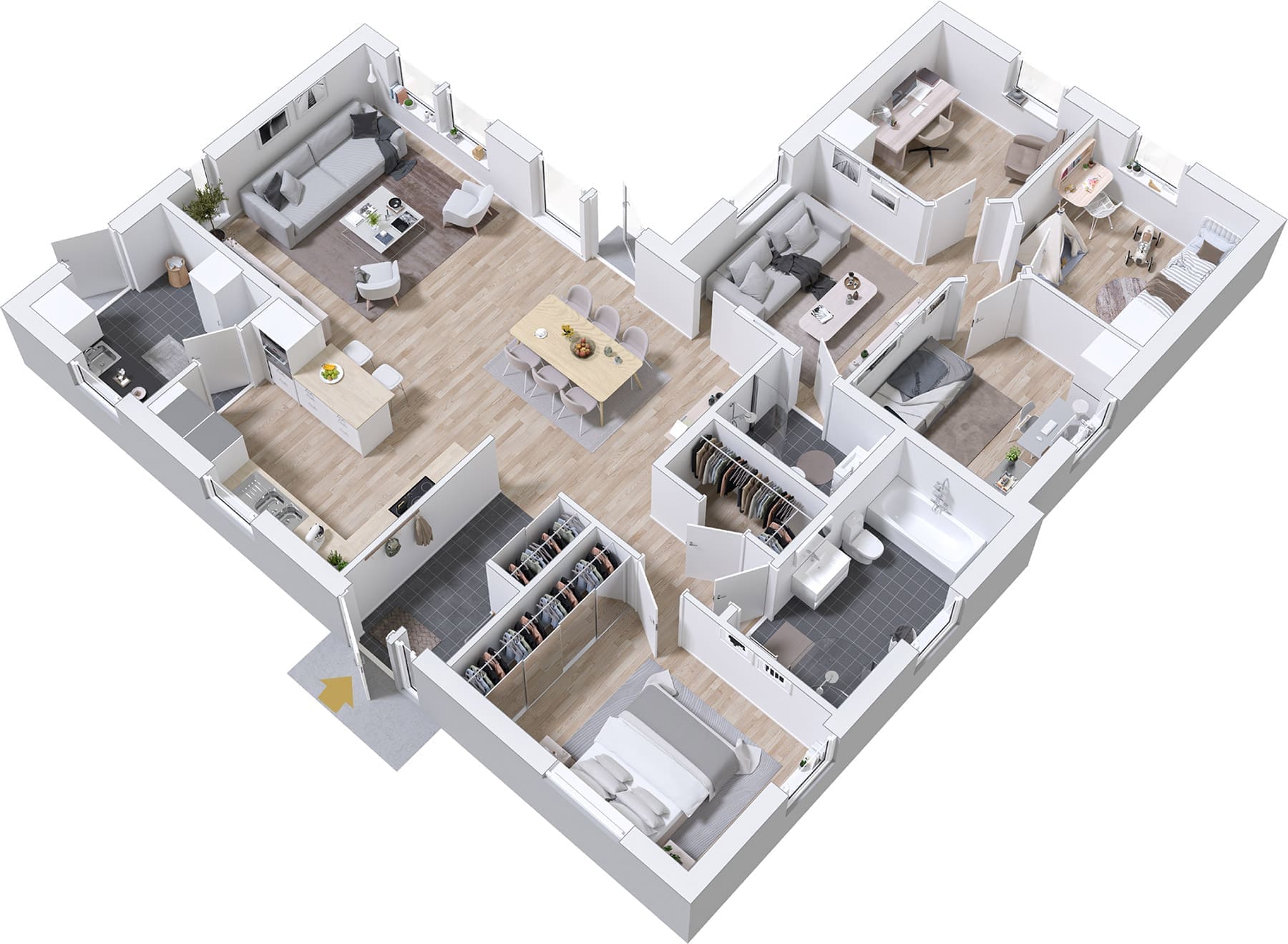 In der Nähe des Eingangs befindet sich ein begehbarer Kleiderschrank, in dem die ganze Familie Jacken und Mäntel aufhängen aufhängen kann. Das geräumige Badezimmer eignet sich auch für Gäste, da es in der Nähe der gemeinschaftlich genutzten Räume liegt. Da Prio 141 ein Winkelhaus ist, können Sie zwischen den beiden Winkeln einen geschützten Außenbereich schaffen. Um eine gemütliche Atmosphäre zu schaffen, können Sie einen Kamin im Wohnzimmer einbauen lassen.
