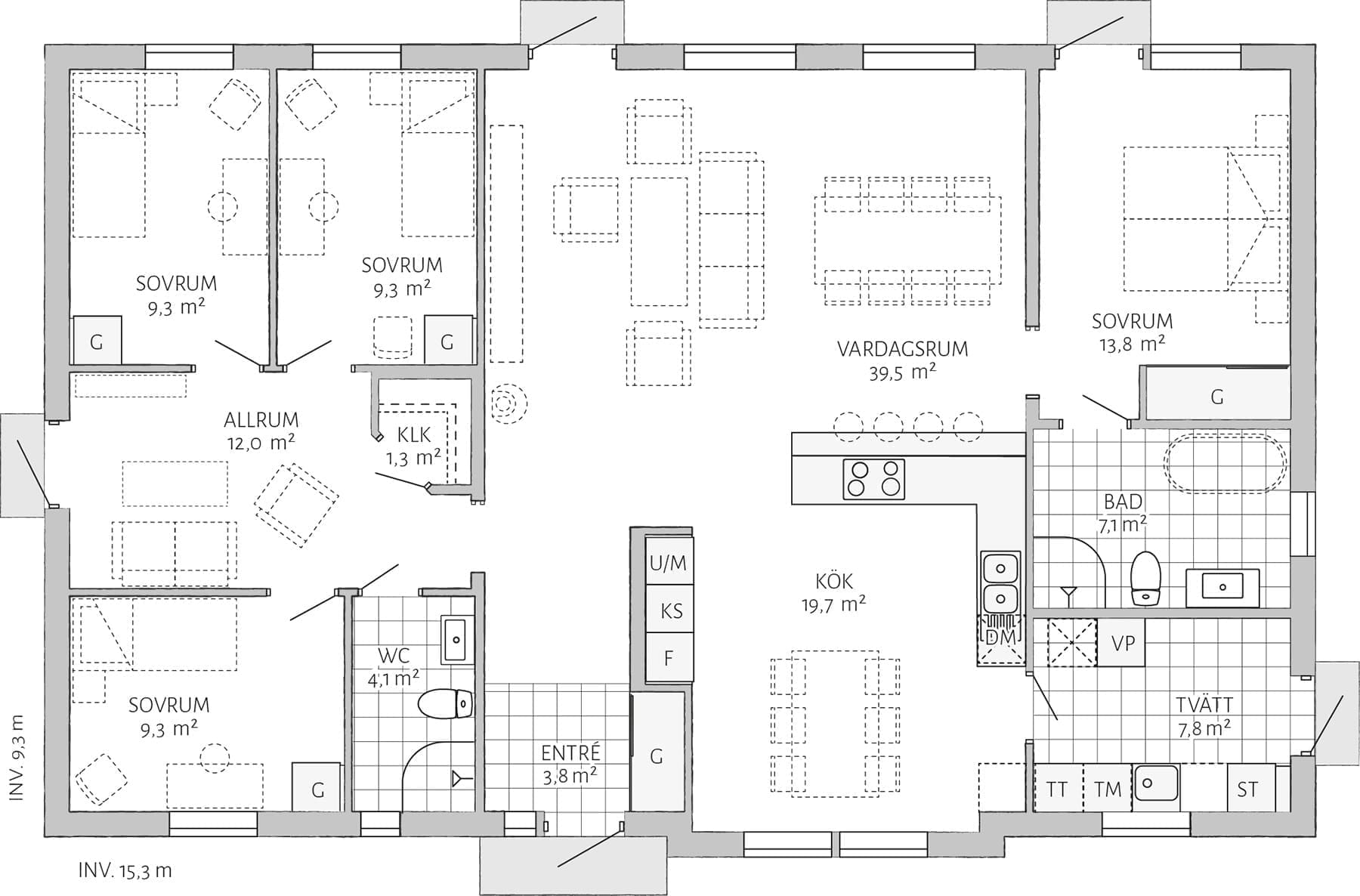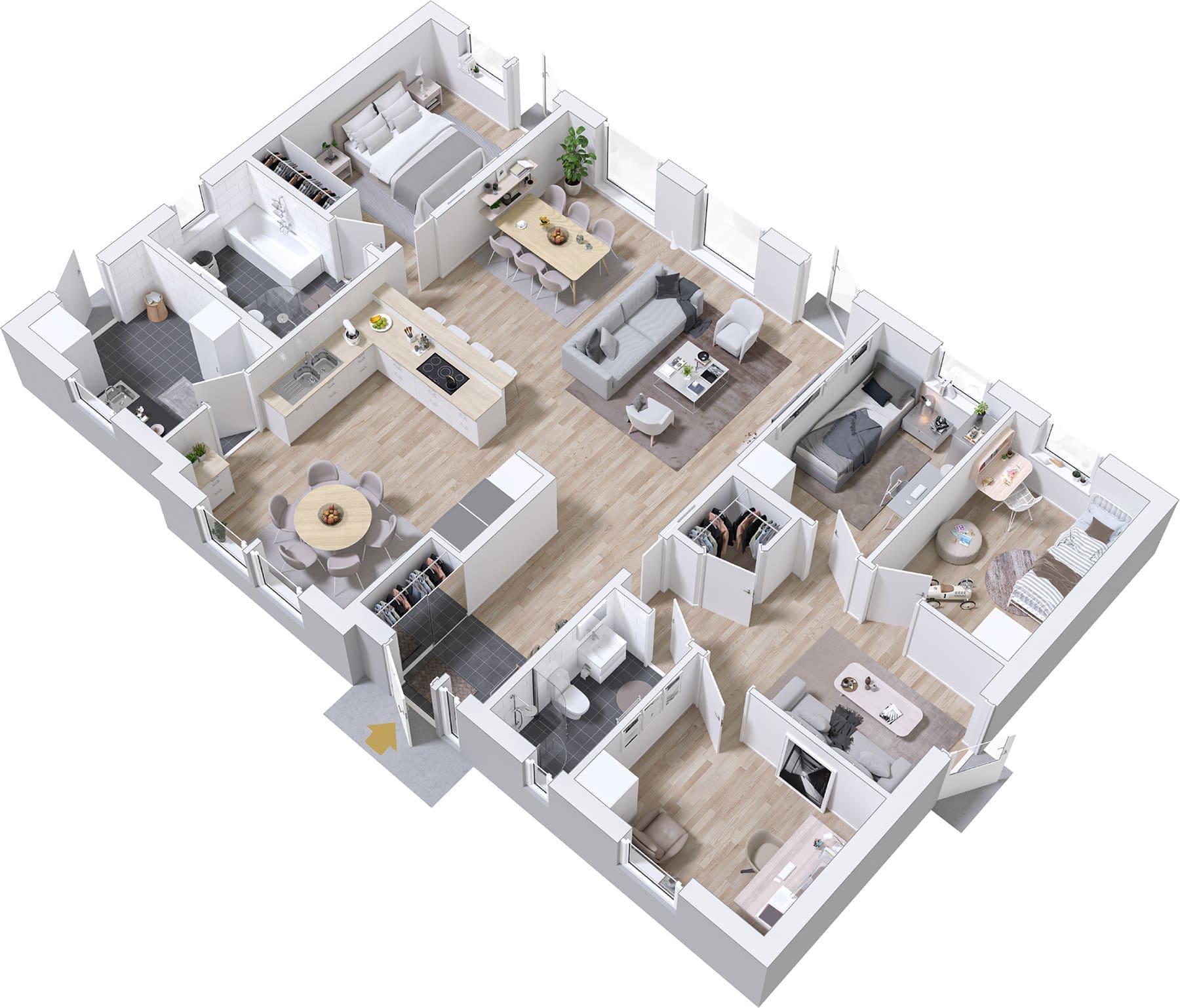 Das Wohnzimmer und die Küche sind zentral platziert und die Gesamtfläche beträgt 59,2 Quadratmeter. Hier haben sowohl Familie, Freunde als auch Verwandte Platz zum Zusammensein. Die vier Schlafzimmer des Hauses sind in zwei Bereiche aufgeteilt, einen für Erwachsene und einen für Kinder oder Jugendliche auf beiden Seiten des Wohnzimmers und der Küche. Wenn die Spielzeuge in Richtung Wohnzimmer streifen, können Sie schnell eine Tür zu den Kinderzimmern sowie ihrem eigenen Aufenthaltsraum und eigenem WC schließen. Im Elternbereich befindet sich das Badezimmer „ensuite“, was luxuriös und angenehm ist.