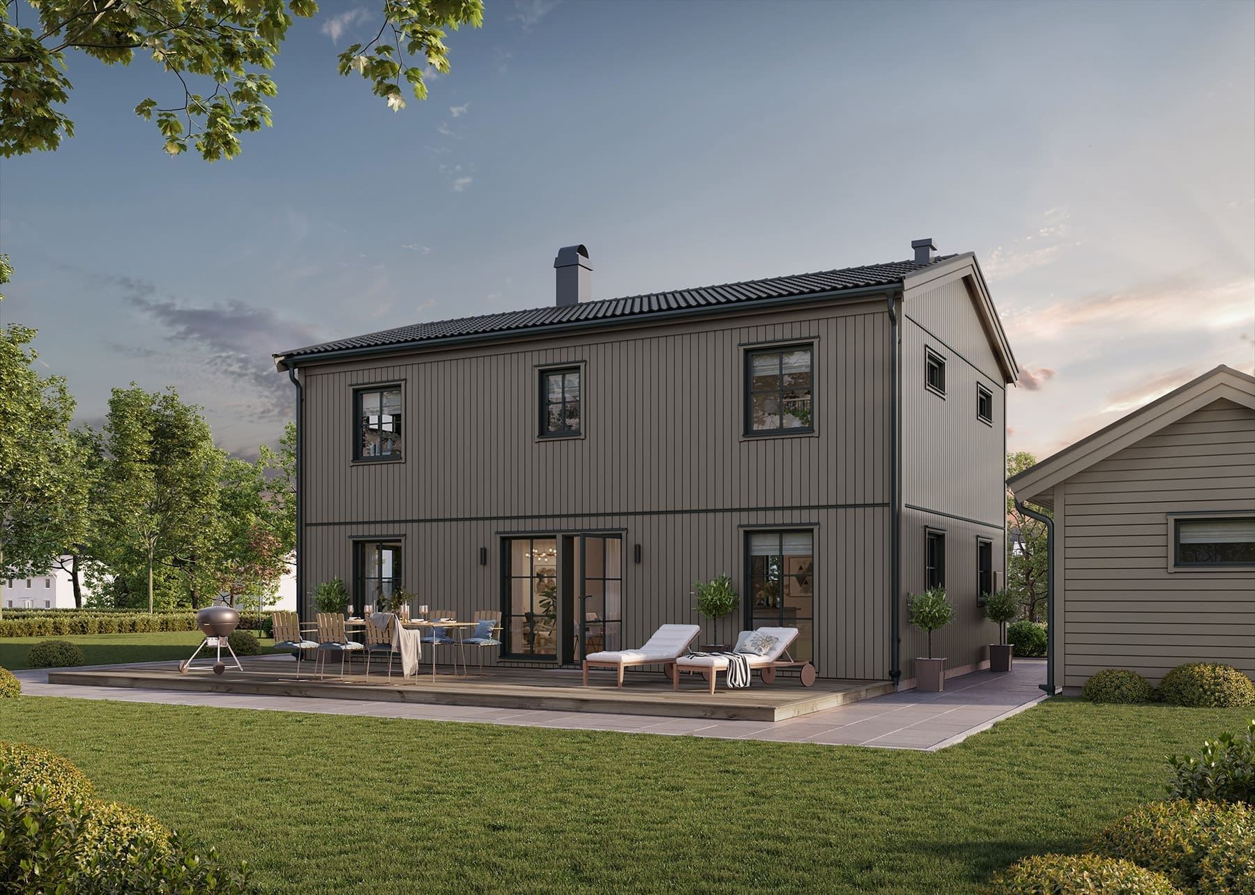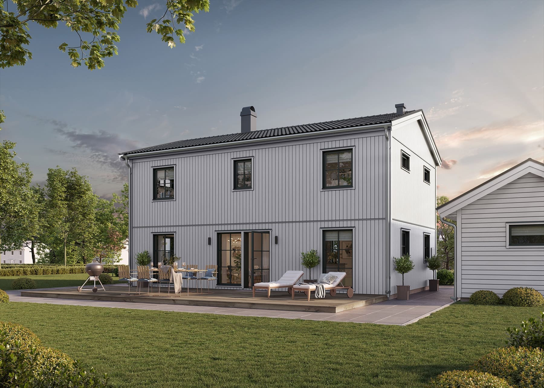 Mit minimalistischen Details erinnert Prio 145 Industriell an Reihenhäuser. Prio 145 ist ein zweigeschossiges Haus, das sich mit der Familie verändern kann. Wenn die Kinder ausziehen, können Sie die Schlafzimmer im Obergeschoss problemlos in begehbare Kleiderschränke oder in ein Home Office verwandeln. Die Treppe, die sich in der Mitte des Hauses befindet, verbirgt viel Stauraum für Kinderkleidung, Sportausrüstung oder Haushaltsgegenstände.