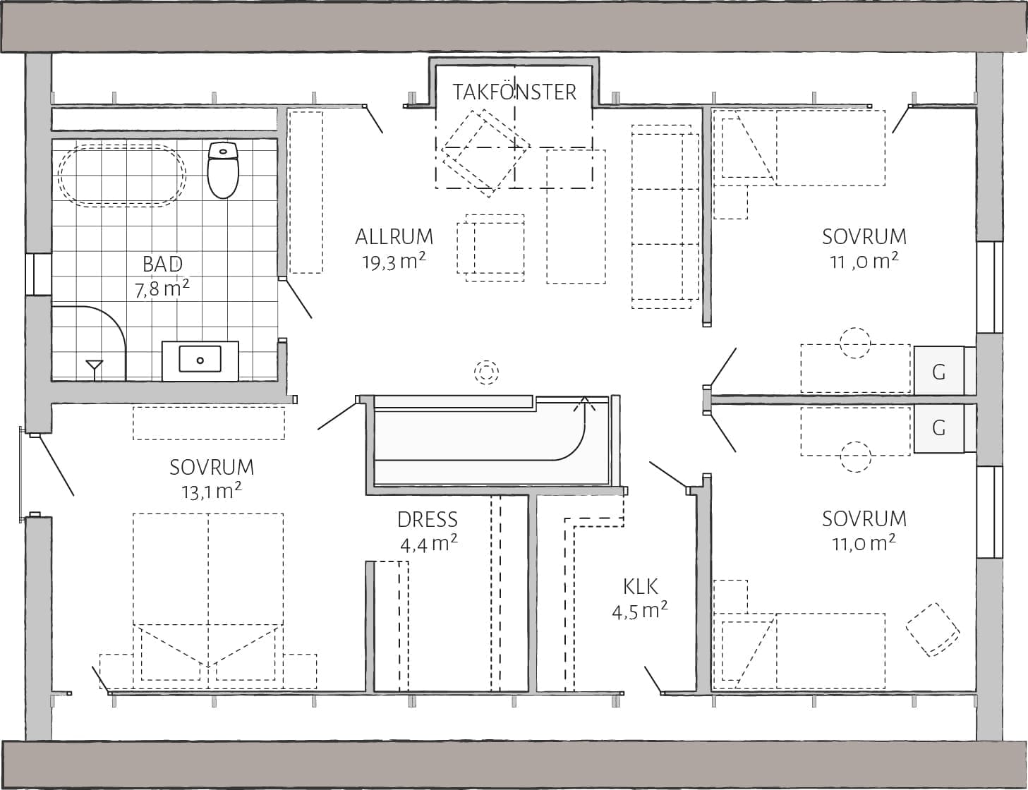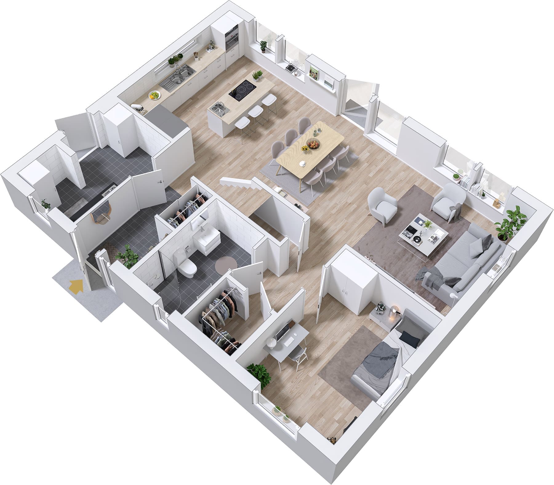 Das Erdgeschoss verfügt über eine eigene Einheit mit Schlafzimmer, begehbarem Kleiderschrank und WC – perfekt für Eltern oder Teenager, die „Platz“ benötigen. Die Treppe zum Obergeschoss befindet sich in der Mitte des Hauses. Das Wohnzimmer im Obergeschoss verfügt über Dachfenster, die das Licht hineinfluten lassen. Von hier aus erreichen Sie das Badezimmer und die drei Schlafzimmer. Und wussten Sie, dass der begehbare Kleiderschrank ganz einfach in ein Arbeitszimmer umgewandelt werden kann? Prio 165 Traditionell ist  ein Haus, in dem eine Familie lange Zeit wohnen kann, ohne sich beengt zu fühlen.