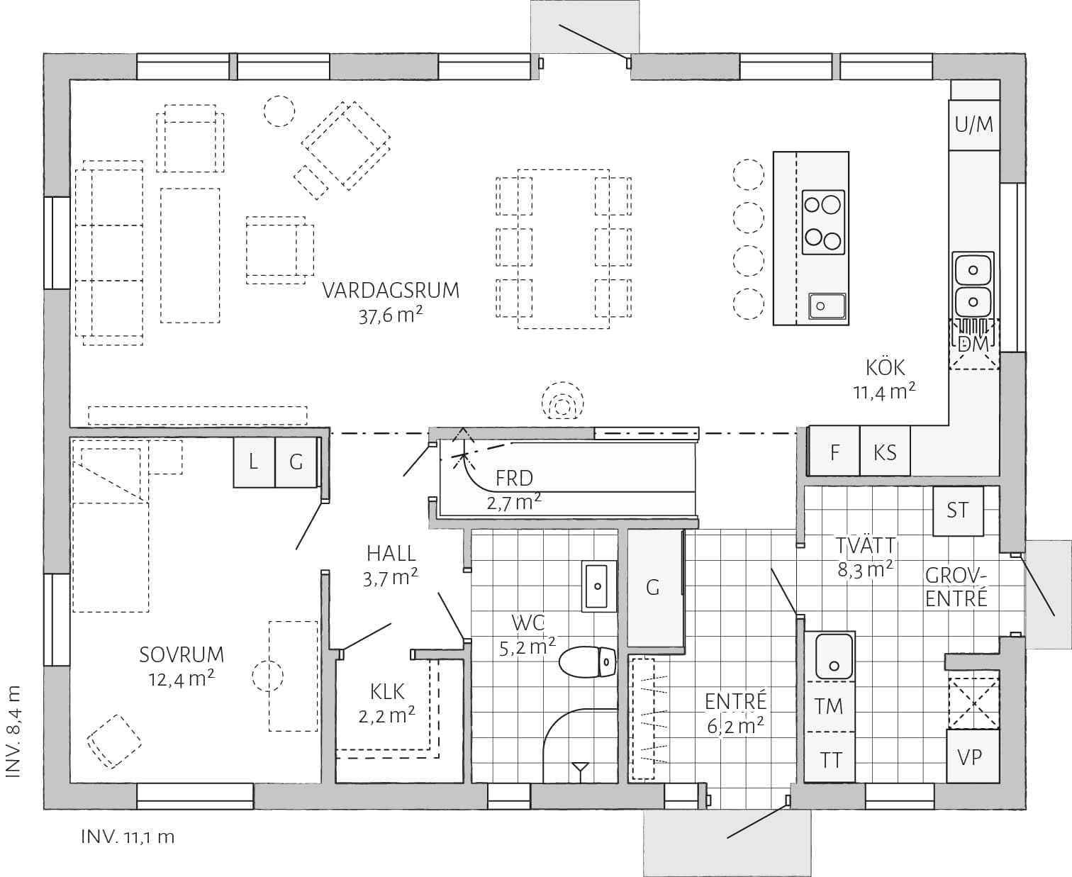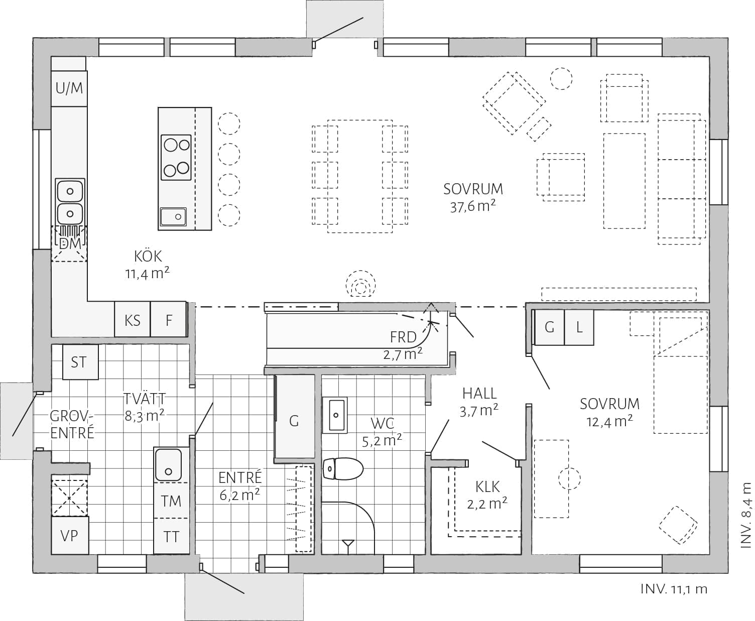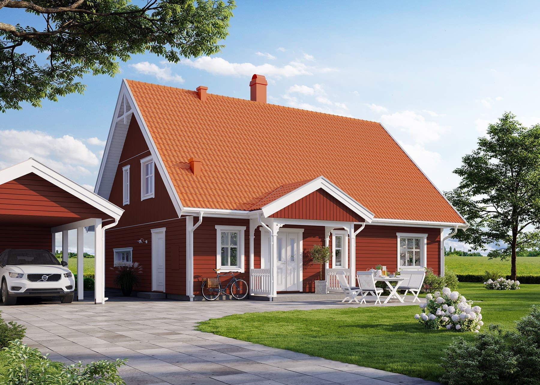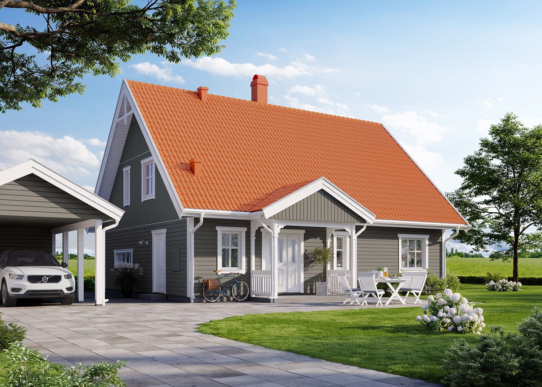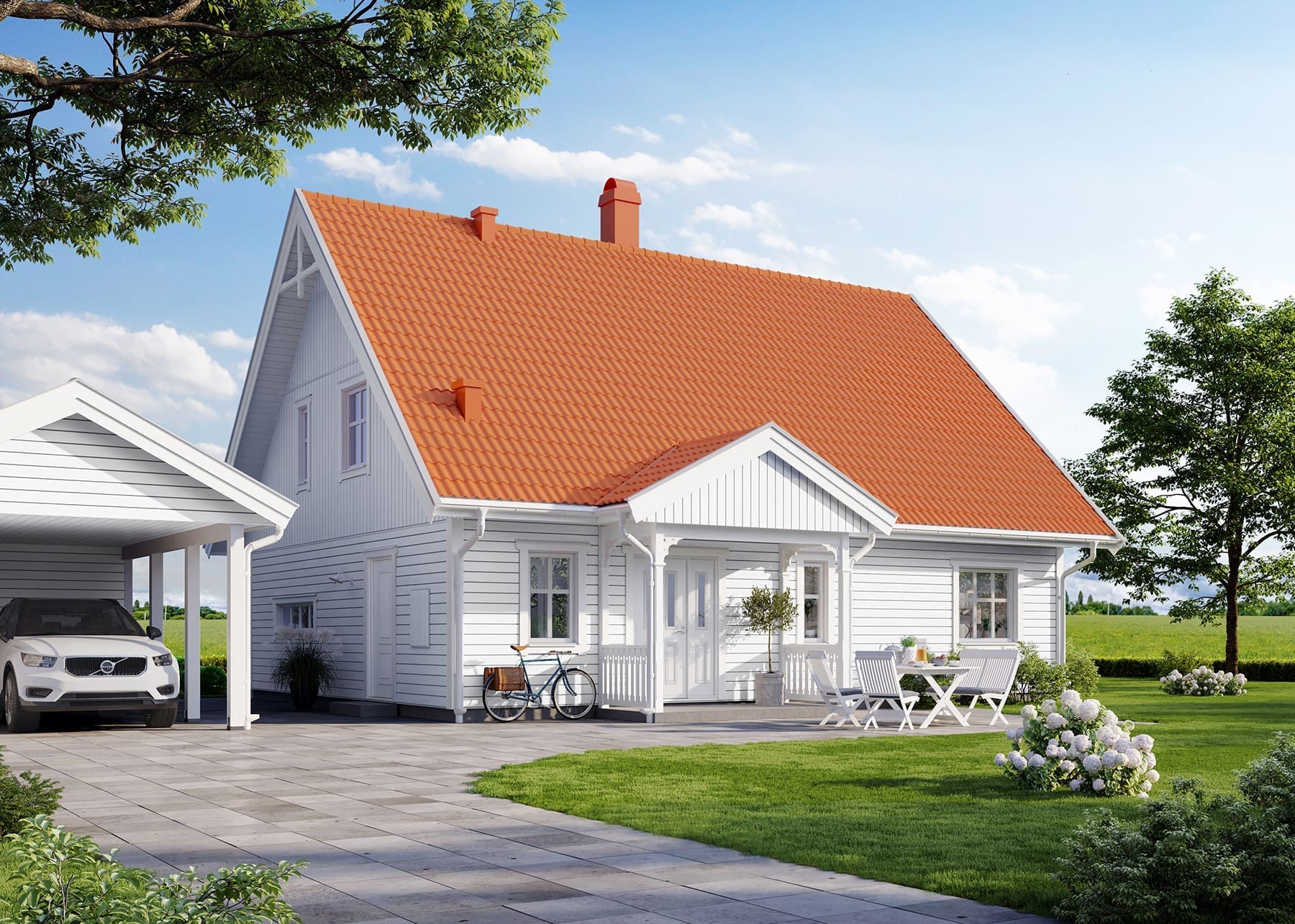 Mit Sprossen, weißen Winkeln und einem schönen Eingang, der die Vorderseite schmückt, ist Prio 165 Traditionell eine Reminiszenz an die schwedische Bautradition und strahlt Geborgenheit aus. Das 1,5-geschossige Haus vermittelt ein Gefühl von viel Licht und Raum, von der offenen Raumaufteilung zwischen Küche und Wohnzimmer bis zu den drei großzügigen Schlafzimmern im Obergeschoss. Für noch mehr Lichteinfall in Küche und Wohnzimmer wählen Sie bodentiefe Fenster und Türen zur Rückseite.